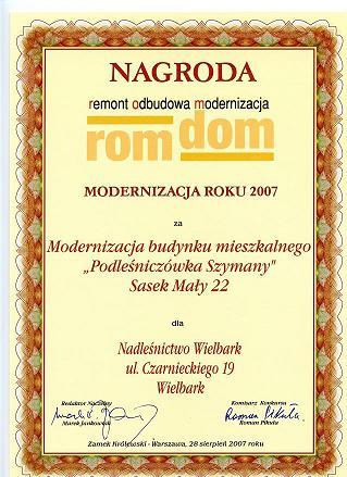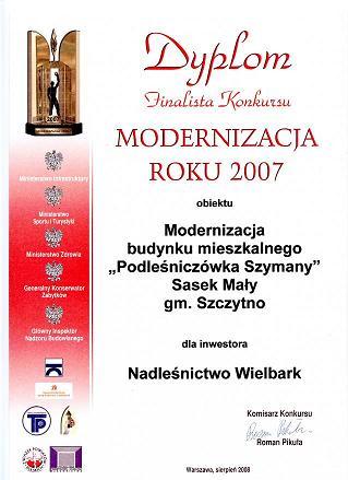 Nadleśnictwo Wielbark zgłosiło do konkursu modernizację budynku mieszkalnego z 1895 roku "Podleśniczówka Szymany" w Sasku Małym. Została ona nominowana do nagrody głównej oraz zdobyła nagrodę specjalną czasopisma "rom dom" za szczególną dbałość o zachowanie zewnętrznych walorów zabytkowych drewnianej leśniczówki i dostosowanie wnętrz obiektu do współczesnych wymagań mieszkalnych.